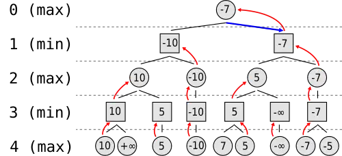 The algorithm evaluates each leaf node using a heuristic evaluation function, obtaining the values shown. The moves where the maximizing player wins are assigned with positive infinity, while the moves that lead to a win of the minimizing player are assigned with negative infinity. At level 3, the algorithm will choose, for each node, the smallest of the child node values, and assign it to that same node (e.g. the node on the left will choose the minimum between "10" and "+∞", therefore assigning the value "10" to itself). The next step, in level 2, consists of choosing for each node the largest of the child node values. Once again, the values are assigned to each parent node. The algorithm continues evaluating the maximum and minimum values of the child nodes alternately until it reaches the root node, where it chooses the move with the largest value (represented in the figure with a blue arrow). This is the move that the player should make in order to minimize the maximum possible loss.