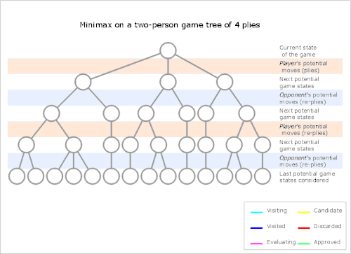 Suppose the game being played only has a maximum of two possible moves per player each turn. The algorithm generates the tree on the right, where the circles represent the moves of the player running the algorithm (maximizing player), and squares represent the moves of the opponent (minimizing player). Because of the limitation of computation resources, as explained above, the tree is limited to a look-ahead of 4 moves.