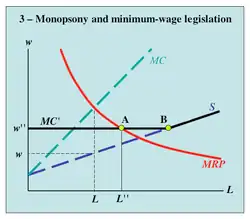 An alternate view of the labor market has low-wage labor markets characterized as monopsonistic competition wherein buyers (employers) have significantly more market power than do sellers (workers). This monopsony could be a result of intentional collusion between employers, or naturalistic factors such as segmented markets, search costs, information costs, imperfect mobility and the personal element of labor markets. Such a case is a type of market failure and results in workers being paid less than their marginal value. Under the monopsonistic assumption, an appropriately set minimum wage could increase both wages and employment, with the optimal level being equal to the marginal product of labor.[56] This view emphasizes the role of minimum wages as a market regulation policy akin to antitrust policies, as opposed to an illusory "free lunch" for low-wage workers.