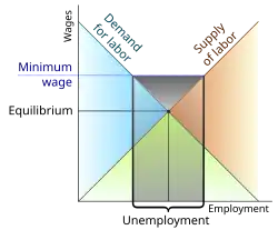 Supply and demand models suggest that there may be employment losses from minimum wages; however, minimum wages can increase the efficiency of the labor market and employment in monopsony scenarios, where individual employers have a degree of wage-setting power over the market as a whole.[7][8][9] Supporters of the minimum wage say it increases the standard of living of workers, reduces poverty, reduces inequality, and boosts morale.[10] In contrast, opponents of the minimum wage say it increases poverty and unemployment because some low-wage workers "will be unable to find work ... [and] will be pushed into the ranks of the unemployed".[11][12][13]