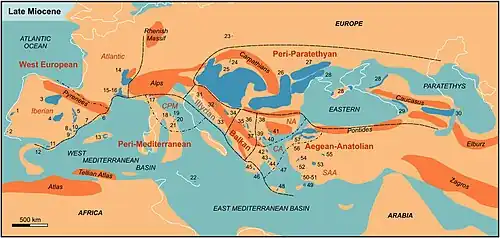 At the beginning of the Miocene, the northern margin of the Arabian plate, then part of the African landmass, collided with Eurasia; as a result, the Tethys seaway continued to shrink and then disappeared as Africa collided with Eurasia in the TurkishArabian region.[19] The first step of this closure occurred 20 Ma, reducing water mass exchange by 90%, while the second step occurred around 13.8 Ma, coincident with a major expansion of Antarctic glaciers.[25] This severed the connection between the Indian Ocean and the Mediterranean Sea and formed the present land connection between Afro-Arabia and Eurasia.[26] The subsequent uplift of mountains in the western Mediterranean region and a global fall in sea levels combined to cause a temporary drying up of the Mediterranean Sea (known as the Messinian salinity crisis) near the end of the Miocene.[27] The Paratethys underwent a significant transgression during the early Middle Miocene.[28] Around 13.8 Ma, during a global sea level drop, the Eastern Paratethys was cut off from the global ocean by the closure of the Bârlad Strait, effectively turning it into a saltwater lake. From 13.8 to 13.36 Ma, an evaporite period similar to the later Messinian salinity crisis in the Mediterranean ensued in the Central Paratethys, cut off from sources of freshwater input by its separation from the Eastern Paratethys. From 13.36 to 12.65 Ma, the Central Paratethys was characterised by open marine conditions, before the reopening of the Bârlad Strait resulted in a shift to brackish-marine conditions in the Central Paratethys, causing the Badenian-Sarmatian Extinction Event. As a result of the Bârlad Strait's reopening, the lake levels of the Eastern Paratethys dropped as it once again became a sea.[29]