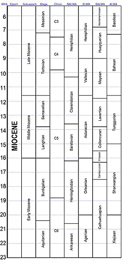 Regionally, other systems are used, based on characteristic land mammals; some of them overlap with the preceding Oligocene and following Pliocene Epochs: