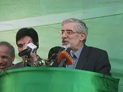 For the 2009 Iranian presidential election, Mousavi came out of semi-retirement and ran as one of two Reformist candidates against the administration of incumbent Iranian President Mahmoud Ahmadinejad. According to official results, he did not win the election, and following alleged vote-rigging and manipulation, his campaign sparked a long protest that eventually turned into a national and international movement against the government and Supreme Leader. Despite the crackdown, he remains the leader of the Green Movement but has been severely restricted by Iranian authorities.[8] He is currently under house arrest along with his wife Zahra Rahnavard and Mehdi Karroubi.[9]