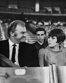 During a 1965 summer gala, added to the Enrico Macias concert by Raoul Colombe (her first manager), Mathieu met her future manager, Johnny Stark.[5][12] Mathieu and her father initially thought Stark was American, based on his name and demeanor, and they nicknamed him l'Américain. Stark had worked with artists such as Yves Montand, and the relationship between him and Mathieu is often likened to that of Colonel Tom Parker and Elvis Presley.[13] Stark is credited with making her a star and the successor to Piaf.[14] By 1968, under his careful management, she had become France's most popular singer.[12]