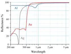 The reflectivity is often determined by the type and thickness of the coating. When the thickness of the coating is sufficient to prevent transmission, all of the losses occur due to absorption. Aluminium is harder and more resistant to tarnishing than silver, and will reflect 85 to 90% of the light in the visible to near-ultraviolet range, but experiences a drop in its reflectance between 800 and 900 nm. Gold is very soft and easily scratched, but does not tarnish. Gold is greater than 96% reflective to near and far-infrared light between 800 and 12000 nm, but poorly reflects visible light with wavelengths shorter than 600 nm (yellow). Silver is expensive, soft, and quickly tarnishes, but has the highest reflectivity in the visual to near-infrared of any metal. Silver can reflect up to 98 or 99% of light to wavelengths as long as 2000 nm, but loses nearly all reflectivity at wavelengths shorter than 350 nm.