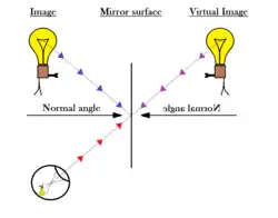 Mirrors reflect an image to the observer. However, unlike a projected image on a screen, an image does not actually exist on the surface of the mirror. For example, when two people look at each other in a mirror, both see different images on the same surface. When the light waves converge through the lens of the eye they interfere with each other to form the image on the surface of the retina, and since both viewers see waves coming from different directions, each sees a different image in the same mirror. Thus, the images observed in a mirror depend upon the angle of the mirror with respect to the eye. The angle between the object and the observer is always twice the angle between the eye and the normal, or the direction perpendicular to the surface. This allows animals with binocular vision to see the reflected image with depth perception and in three dimensions.