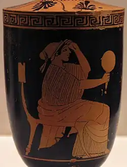 Right: seated woman holding a mirror; Ancient Greek Attic red-figure lekythos by the Sabouroff Painter, c. 470–460 BC, National Archaeological Museum, Athens (Greece)