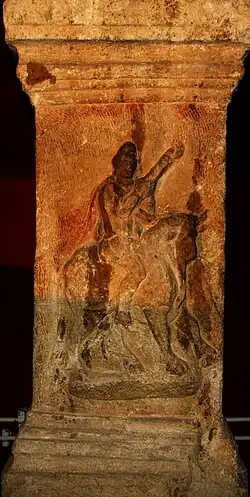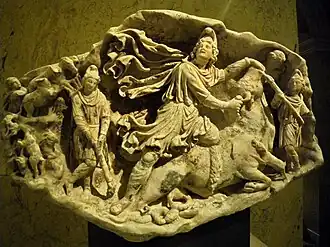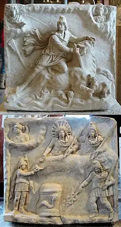 In some depictions, the central tauroctony is framed by a series of subsidiary scenes to the left, top and right, illustrating events in the Mithras narrative; Mithras being born from the rock, the water miracle, the hunting and riding of the bull, meeting Sol who kneels to him, shaking hands with Sol and sharing a meal of bull-parts with him, and ascending to the heavens in a chariot.[26] In some instances, as is the case in the stucco icon at Santa Prisca Mithraeum in Rome, the god is shown heroically nude.[s] Some of these reliefs were constructed so that they could be turned on an axis. On the reverse was another, more elaborate feasting scene. This indicates that the bull killing scene was used in the first part of the celebration, then the relief was turned, and the second scene was used in the second part of the celebration.[28] Besides the main cult icon, a number of mithraea had several secondary tauroctonies, and some small portable versions, probably meant for private devotion, have also been found.[29]