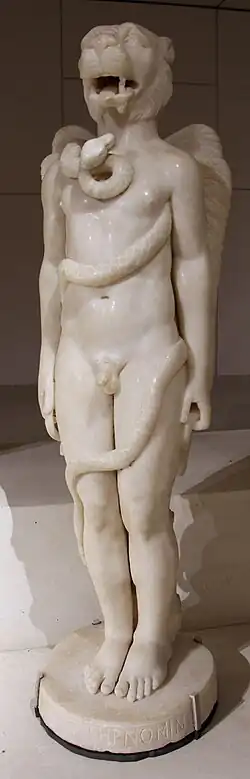 Some scholars identify the lion-man as Aion, or Zurvan, or Cronus, or Chronos, while others assert that it is a version of the Zoroastrian Ahriman or the more benign Vedic Aryaman.[u] Although the exact identity of the lion-headed figure is debated by scholars, it is largely agreed that the god is associated with time and seasonal change.[40](p 94)