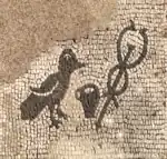There were seven grades of initiation into Mithraism, which are listed by St. Jerome.[58] Manfred Clauss states that the number of grades, seven, must be connected to the planets. A mosaic in the Mithraeum of Felicissimus, Ostia Antica depicts these grades, with symbolic emblems that are connected either to the grades or are symbols of the planets. The grades also have an inscription beside them commending each grade into the protection of the different planetary gods.[4]: 132–133 In ascending order of importance, the initiatory grades were:[4](p 133–138)