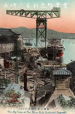 In 1857, at the request of the Tokugawa Shogunate, a group of Dutch engineers were invited, including Dutch naval engineer Hendrik Hardes, and began work on the Nagasaki Yotetsusho (長崎鎔鉄所), a modern, Western-style foundry and shipyard near the Dutch settlement of Dejima, at Nagasaki.[7][8] This was renamed Nagasaki Seitetsusho (長崎製鉄所) Nagasaki Iron (Steel) Foundry in 1860, and construction was completed in 1861. Following the Meiji Restoration of 1868, the shipyard was placed under control of the new Government of Meiji Japan. The first dry dock was completed in 1879.