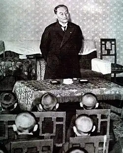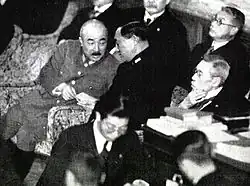 Emperor Shōwa (Hirohito) trusted Yonai's strong moral character. By July 1944, the situation of World War II was apparently against Japan. As for this difficult circumstance, the Imperial Japanese Navy was in a confusion. Supreme commanders of the Imperial Japanese Navy decided to appoint Yonai as the Minister of Navy because he had popularity and charisma enough to unite the Imperial Japanese Navy, although Yonai had already retired. To assign Yonai as the Minister of Navy, the Emperor's consent was necessary. Meanwhile, Admiral Suetsugu was also a candidate. The Emperor selected Yonai because Suetsugu was famous for his ambition, and allowed Yonai to be the Minister of Navy even though he was no longer in active service. This appointment demonstrated Shōwa's trust in Yonai because he is the only one person in the Imperial Japanese Navy's history to return from retirement and be posted to the supreme position as the Minister of Navy. After the Imperial Japanese Navy was defeated, the Emperor called Yonai to the palace. The Emperor amiably invited Yonai to have lunch together. After that, the Emperor said, "I really appreciated your duty and effort not to begin the war. I think we are not going to meet often like before". He put a pen and inkstone into a case and said, "These are the things that I have used. I would like to present this as a gift to you."[11] This action is extremely rare because having presented the belongings of the Emperor is the supreme honor and the utmost expression of amiability.[9]
