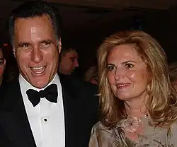 At their first meeting following his return, Romney and Ann Davies reconnected and decided to get married.[48] Before their wedding, Romney moved to Utah and enrolled at Brigham Young University, where Ann had been studying.[49] They married on March 21, 1969, in a civil ceremony in Bloomfield Hills and the next day, they flew to Utah for a Mormon wedding ceremony at the Salt Lake Temple; Ann had converted to the faith while he was away.[50][51]