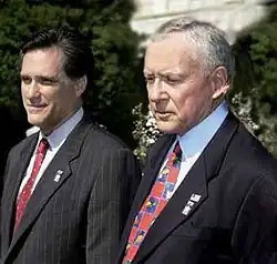By 1993, Romney had begun thinking about entering politics, partly on Ann's urging and also to follow in his father's footsteps.[50] He decided to challenge incumbent Democratic U.S. senator Ted Kennedy, who was seeking reelection to a sixth term. Political pundits viewed Kennedy as vulnerable that year, in part because of the unpopularity of the Democratic Congress as a whole, and in part because this was Kennedy's first election since the William Kennedy Smith trial in Florida, in which Kennedy's reputation had suffered.[119][120][121] Romney changed his affiliation to Republican in October 1993 and formally announced his candidacy in February 1994.[50] In addition to his leave from Bain Capital, Romney also stepped down from his church leadership role in 1994.[65]