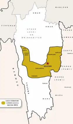 The migration of the Lusei tribe from the neighbouring region, prompted by conflicts with the Chins (or "Pawi" in Mizo), led to the establishment of this significant site. Around 1720, the tribe, under the leadership of Chief Sailova’s sons, Chungnunga and Lianlula, created a refuge in Selesih,[57] forming a confederation of seven chiefs to defend their land. This confederation brought together a diverse range of tribes from the region, including the five major tribes and twelve minor tribes, creating a peaceful coexistence among them. The settlement, with a population estimated to be between 50,000 and 100,000, housed approximately 7,000 homes, making it one of the most prosperous and populous settlements in ancient Mizoram.[58][59]