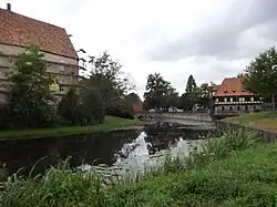 A moat is a deep, broad ditch dug around a castle, fortification, building, or town, historically to provide it with a preliminary line of defence. Moats can be dry or filled with water. In some places, moats evolved into more extensive water defences, including natural or artificial lakes, dams and sluices. In older fortifications, such as hillforts, they are usually referred to simply as ditches, although the function is similar. In later periods, moats or water defences may be largely ornamental. They could also act as a sewer.