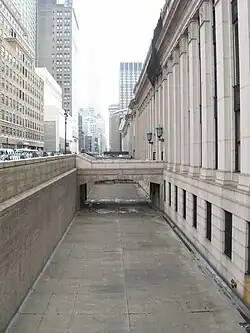 Dry moats were a key element used in French Classicism and Beaux-Arts architecture dwellings, both as decorative designs and to provide discreet access for service. Excellent examples of these can be found in Newport, Rhode Island at Miramar (mansion) and The Elms, as well as at Carolands, outside of San Francisco, California, and at Union Station in Toronto, Ontario, Canada. Additionally, a dry moat can allow light and fresh air to reach basement workspaces, as for example at the James Farley Post Office in New York City.