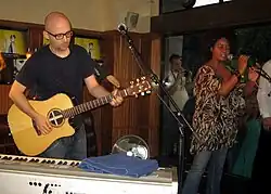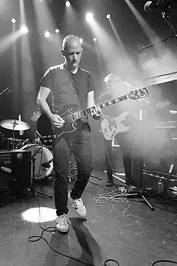 In 1989, Moby relocated to New York City with his close friend, artist Damian Loeb.[12][20] In addition to performing DJ sets in local bars and clubs, he played guitar in alternative rock group Ultra Vivid Scene and appeared in the video for their 1989 single "Mercy Seat".[31][32] In 1990, Moby joined industrial noise group Shopwell and played on their album Peanuts.[33][34] Moby's first live electronic music gig followed in the summer of 1990 at Club MK; he wore a suit for the show.[26][35] His future manager Eric Härle, who was in attendance, recalled Moby's set: "The music was amazing, but the show was riddled with technical mishaps. It left me very intrigued and impressed in a strange way."[36]