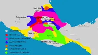Another notable rebellion occurred in Atlixco (in modern-day Puebla), a city neighboring Tlaxcala which had previously been conquered by Ahuizotl.[17] This rebellion occurred in 1508, and was repressed by a prince named Macuilmalinatzin.[25] This wasn't the first conflict that occurred in this region, as its proximity with Tlaxcala and Huejotzingo would cause multiple conflicts to erupt in this area during Moctezuma's reign.