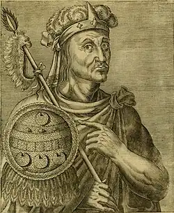 Moctezuma Xocoyotzin[N.B. 1] (c. 1466 – 29 June 1520), retroactively referred to in European sources as Moctezuma II, and often simply called Montezuma,[N.B. 2] was the ninth emperor of the Aztec Empire (also known as the Mexica Empire),[1] reigning from 1502 or 1503 to 1520. Through his marriage with Queen Tlapalizquixochtzin of Ecatepec, one of his two wives, he was also the king consort of the altepetl.[2]