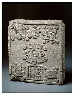 The year in which Moctezuma was crowned is uncertain. Most historians suggest the year 1502 to be most likely, though some have argued in favor of the year 1503. A work currently held at the Art Institute of Chicago known as the Stone of the Five Suns is an inscription written in stone representing the Five Suns and a date le 11 reed, which is equivalent to 15 July 1503 in the Gregorian calendar. Some historians believe this to be the exact date on which the coronation took place, as it is also included in some primary sources.[20][21] Other dates have been given from the same year; Fernando de Alva Cortés Ixtlilxóchitl states that the coronation took place on 24 May 1503.[22] However, most documents say Moctezuma's coronation happened in the year 1502, and therefore most historians believe this to have been the actual date.[13]