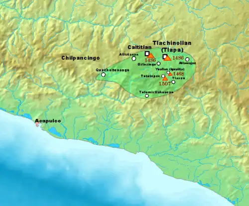 The conquest of Tototepec formed part of the conquests of some of the last few Tlapanec territories of modern-day Guerrero, an area which had already been in decline since Moctezuma I began his first campaigns in the region and probably turned the Kingdom of Tlachinollan (modern-day Tlapa) into a tributary province during the rule of Lord Tlaloc between 1461 and 1467 (though the kingdom would not be invaded and fully conquered until the reign of Ahuizotl in 1486, along with Caltitlan, a city neighboring west of Tlapa). In between the years of 1503 and 1509, a campaign was launched against Xipetepec, and another was launched (as mentioned previously) in 1507 against Tototepec, which had previously been a territory conquered by Tlachinollan in the mid-14th century. The campaign in Tototepec occurred as the result of a large group of Mexica merchants sent by Moctezuma being killed after they attempted to trade for some of the resources of the area on his behalf.[60] During the conquest of Tototepec, two important Mexica noblemen, Ixtlilcuechahuac and Huitzilihuitzin (not to be confused with the tlatoani of this name), were killed.[25] All the population of Tototepec, except for the children, was massacred by the Mexica forces, and about 1350 captives were taken.[61] Another campaign was launched in 1515 to conquer Acocozpan and Tetenanco and reconquer Atlitepec, which had been previously conquered by Ahuizotl in 1493.[62]