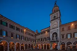 It is characterized by a Clock Tower (Torre dell'Orologio, late 15th century), once paired with another tower (Torre Civica) demolished after an earthquake in 1671. In the interior, noteworthy is the Sala del Fuoco ("Fire Hall"), with a painted frieze by Niccolò dell'Abbate (1546) portraying famous characters from Ancient Rome against a typical Emilia background. The Camerino dei Confirmati ("Chamber of the Confirmed") houses one of the symbols of the city, the Secchia Rapita, a bucket kept in memory of the victorious Battle of Zappolino (1325) against Bologna. This relic inspired the poem of the same title by Alessandro Tassoni. Another relic from the Middle Ages in Modena is the Preda Ringadora, a rectangular marble stone next to the palace porch, used as a speakers' platform, and the statue called La Bonissima ("The Very Good"): the latter, portraying a female figure, was erected in the square in 1268 and later installed over the porch.