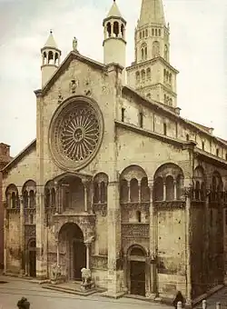 The Cathedral of Modena and the annexed campanile are a UNESCOWorld Heritage Site. Begun under the direction of the Countess Matilda of Tuscany[7] with its first stone laid 6 June 1099 and its crypt ready for the city's patron, Saint Geminianus, and consecrated only six years later, the Duomo of Modena was finished in 1184. The building of a great cathedral in this flood-prone ravaged former center of Arianism was an act of urban renewal in itself, and an expression of the flood of piety that motivated the contemporary First Crusade. Unusually, the master builder's name, Lanfranco, was celebrated in his own day: the city's chronicler expressed the popular confidence in the master-mason from Como, Lanfranco: by God's mercy the man was found (inventus est vir).