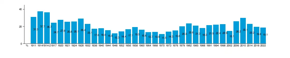 After the Second World War, the party gradually lost support and the Liberals rose to become the second most popular party after the Social Democrats.