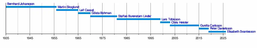 The current chairman of the party, Ulf Kristersson, was elected at a special party congress on 1 October 2017, following Anna Kinberg Batra's sudden resignation. Kinberg Batra had replaced Reinfeldt, Prime Minister from 2006 to 2014. Under Reinfeldt's leadership, the party moved more towards the centre.[11] Under Kristersson's leadership, the party moved back to the right and opened up to the Sweden Democrats (SD) following the 2018 Swedish general election.[12] Having formed in late 2021 an informal right-wing alliance with SD and former Alliance members, KD and L, with Kristersson as the prime ministerial candidate, the right-wing bloc obtained a narrow win in the 2022 Swedish general election.[13][14]