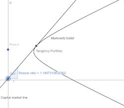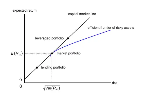 The introduction of a risk-free asset transforms the efficient frontier into a linear half-line tangent to the Markowitz bullet at the portfolio with the highest Sharpe ratio.[8] The vertical intercept of this line represents a portfolio allocated 100% to the risk-free asset .[17] The tangency point denotes a portfolio with 100% investment in risky assets, while segments between the intercept and tangency represent lending portfolios (long ).[9] Points extending beyond the tangency point represent borrowing portfolios, where the investor leverages the risky tangency portfolio by shorting the risk-free asset.[8] This efficient locus is defined as the capital allocation line (CAL), expressed by the formula: