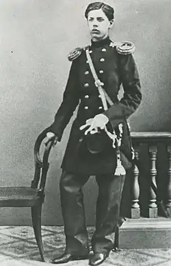 Mussorgsky's parents planned the move to Saint Petersburg so that both their sons would renew the family tradition of military service.[21] Mussorgsky entered the Cadet School of the Guards at age 13. Controversy had arisen over the educational attitudes at the time of both this institute and its director, General Sutgof.[22] All agreed the Cadet School could be a brutal place, especially for new recruits.[23] More tellingly for Mussorgsky, it was likely where he began his eventual path to alcoholism.[23] According to a former student, singer and composer Nikolai Kompaneisky, Sutgof "was proud when a cadet returned from leave drunk with champagne."[24]