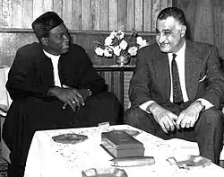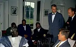 In June 1961, he paid a state visit to the United Kingdom, where Queen Elizabeth II invested him as an honorary Knight Grand Cross of the Order of Saint Michael and Saint George.[8] Although Keïta was initially viewed with some wariness by the United States because of his socialist views, he made it clear that he sought good relations with Washington. In September 1961, he travelled to America in the company of President Sukarno and met with President John F. Kennedy. Keïta, afterward, felt that he had a friend in Kennedy. He travelled to the United States after the 1st Summit of the Non-Aligned Movement in Belgrade, FPR Yugoslavia where the conference delegated him with expressing their common positions to the American administration.