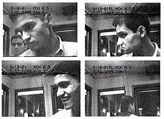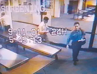 Atta (blue shirt) and al-Omari in the Portland International Jetport in Portland, Maine, on the morning of 11 September