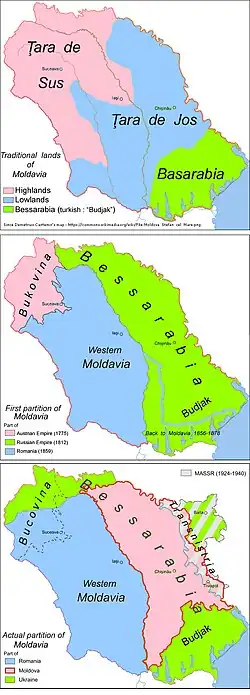 The western half of Moldavia is now part of Romania, the eastern side belongs to the Republic of Moldova, and the northern and southeastern parts are territories of Ukraine.