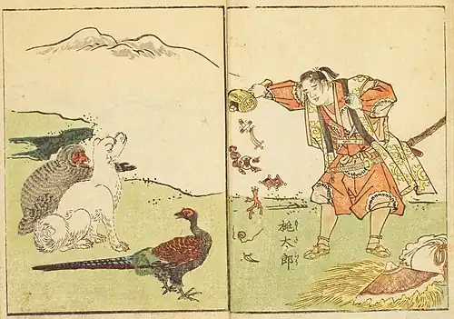 Momotarō is not supplied with kibi dango ("millet dumplings"), but rather with tō dango (とう団子) and other treats in the oldest Genroku era texts and the first group.[17] In the first group, the old man goes out to cut grass, rather than to cut kindling. The same three companion beasts (pheasant, monkey, then dog) appear in both groups, but in a different order.[18] Though the order of the animals is not significant to the story, the most common order that appear is the dog, the monkey, and then the pheasant. In nearly every variation, all three animal companions agree to help Momotarō in exchange for a portion of his food. In one variation from the Edo Period, the dog is given half a portion, the monkey willingly comes, and Momotarō threatens the pheasant.
