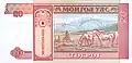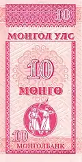 10 möngö | 45 × 90 mm | Pink | Soyombo, Archery | Archery | — | 1993 | Very rare in circulation. Abundant among collectors. |