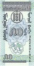 | 10 tögrög (arvan) | 125 × 61 mm | Green | 1993, 2002, 2005, 2007, 2009, 2011, 2013, 2014, 20173, 2018, 2020 | The smallest commonly used note | |||||