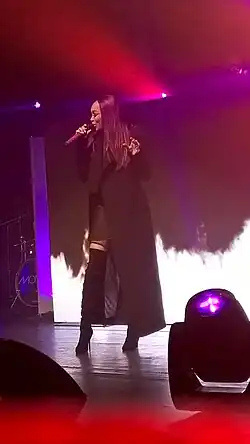 Featuring production by Stargate, Ne-Yo, and Polow da Don, Still Standing was released in March 2010 and garnered a generally positive response by critics, who perceived its sound as "a return to the mid-'90s heyday" of contemporary R&B.[40] The album debuted atop on Billboard's Top R&B/Hip-Hop albums chart, and number two on the Billboard 200 with opening week sales of 184,000 copies, becoming her highest-charting album in years. Lead single "Everything to Me" scored Monica her biggest chart success since 2003's "So Gone", reaching the top position of the Billboard R&B/Hip-Hop Tracks charts for seven weeks. The album was certified gold by the RIAA with domestic shipments of 500,000 copies within a single month.[41] With it success, the album and "Everything to Me" were nominated for a Grammy Award for Best R&B Album and Best Female R&B Vocal Performance, presented at the 53rd Grammy Awards.[42] Monica met future husband and NBA player Shannon Brown in June 2010 when they shot the music video for her second single "Love All Over Me".[43][44][45] Also in 2010, Monica joined Trey Songz on his Passion, Pain & Pleasure Tour, her first North American concert tour in ten years.[46]