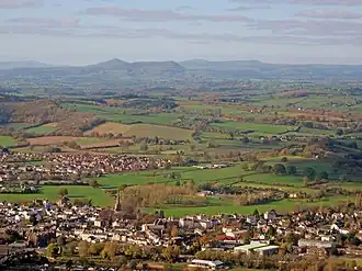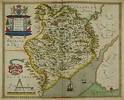 Monmouth's coastline forms its southern border, running the length of the Severn Estuary from Chepstow in the east to the shore south of Magor in the west. The distance, roughly 15 miles (24 km), can be walked via the Wales Coast Path.[106] The coastline includes the eastern part of the Caldicot and Wentloog Levels, also known as the Monmouthshire or Gwent Levels, an almost entirely man-made environment that has seen land reclamation since Roman times.[107] The coastal area is low-lying with few cliffs, making it historically vulnerable to flooding.[108] An extreme example were the 1607 Bristol Channel floods which saw some 2,000 people drowned, with many victims located on Monmouthshire's coastline.[109][110]