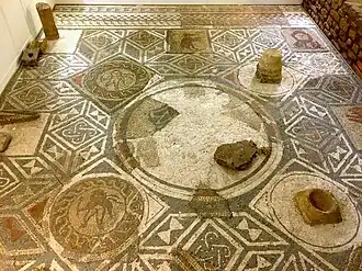 Monmouthshire's most important Roman remains are found at the town of Venta Silurum ("Market of the Silures"), present-day Caerwent in the south of the county. The town was established in AD 75,[13] laid out in the traditional rectangular Roman pattern of twenty insulae with a basilica and a temple flanking a forum.[14] Other Roman settlements in the area included Blestium (Monmouth).[15][b] The Romanisation of Monmouthshire was not without continuing civil unrest; the defences at Caerwent, and at Caerleon, underwent considerable strengthening in the late 2nd century in response to disturbances. The Silurian identity was not extinguished: the establishment of a Respublica Civitatis Silurium (an early town council) at the beginning of the 3rd century testifies to the longevity of the indigenous tribal culture.[17]