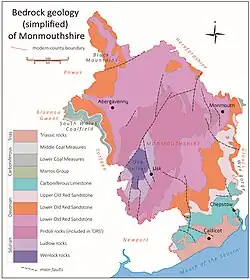 The centre of the principal area is dominated by the Usk Inlier, a large outcrop of Silurian rock. The inlier is surrounded by younger, Devonian, rock, including areas of Old Red Sandstone which forms a very common building material in the county.[104] The Wye Gorge, in the extreme east of the county, has a bed of Carboniferous Limestone.[105]