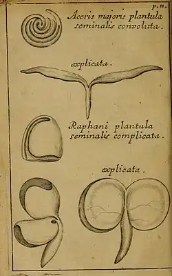 In this experiment, Malpighi also showed that the cotyledons were critical to the development of the plant, proof that Ray required for his theory.[56] In his Methodus plantarum nova[57] Ray also developed and justified the "natural" or pre-evolutionary approach to classification, based on characteristics selected a posteriori in order to group together taxa that have the greatest number of shared characteristics. This approach, also referred to as polythetic would last till evolutionary theory enabled Eichler to develop the phyletic system that superseded it in the late nineteenth century, based on an understanding of the acquisition of characteristics.[58][59][60] He also made the crucial observation Ex hac seminum divisione sumum potest generalis plantarum distinctio, eaque meo judicio omnium prima et longe optima, in eas sci. quae plantula seminali sunt bifolia aut διλόβω, et quae plantula sem. adulta analoga. (From this division of the seeds derives a general distinction amongst plants, that in my judgement is first and by far the best, into those seed plants which are bifoliate, or bilobed, and those that are analogous to the adult), that is between monocots and dicots.[61][56] He illustrated this by quoting from Malpighi and including reproductions of Malpighi's drawings of cotyledons (see figure).[62] Initially Ray did not develop a classification of flowering plants (florifera) based on a division by the number of cotyledons, but developed his ideas over successive publications,[63] coining the terms Monocotyledones and Dicotyledones in 1703,[64] in the revised version of his Methodus (Methodus plantarum emendata), as a primary method for dividing them, Herbae floriferae, dividi possunt, ut diximus, in Monocotyledones & Dicotyledones (Flowering plants, can be divided, as we have said, into Monocotyledons & Dicotyledons).[65]