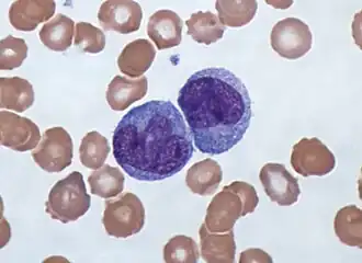 ![]() Monocytes under a light microscope from a peripheral blood smear surrounded by red blood cells | |