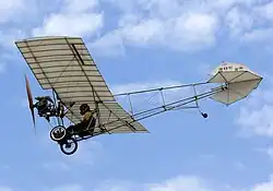 Although the first successful aircraft were biplanes, the first attempts at heavier-than-air flying machines were monoplanes, and many pioneers continued to develop monoplane designs. For example, the first aeroplane to be put into production was the 1907 Santos-Dumont Demoiselle, while the Blériot XI flew across the English Channel in 1909.[10] Throughout 1909–1910, Hubert Latham set multiple altitude records in his Antoinette IV monoplane, eventually reaching 1,384 m (4,541 ft).[11]