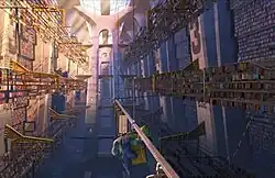 The first fur test featured Sulley running an obstacle course. Results were not satisfactory, as such objects caught and stretched out the fur due to the extreme amount of motion. Another similar test was also unsuccessful, because, this time, the fur went through the objects.[21] Pixar then set up a Simulation department and created a new fur simulation program called Fizt (short for "physics tool").[30] After a shot with Sulley in it had been animated, the department took the data for that shot and added Sulley's fur. Fizt allowed the fur to react in a more natural way. Every time when Sulley had to move, his fur automatically reacted to his movements, thus taking the effects of wind and gravity into account as well. The Fizt program was also used to control the movement of Boo's clothes, which provided another "breakthrough".[30] The deceptively simple-sounding task of animating cloth was a challenge because of the hundreds of creases and wrinkles that occur in clothing when the wearer moves.[31] The team also had to solve the complex problem of how to keep cloth untangled – in other words, to keep it from passing through itself when parts of it intersect.[32] Fizt applied the same system to Boo's clothes as to Sulley's fur. Boo was first animated shirtless; the Simulation department then used Fizt to apply the shirt over Boo's body, allowing her clothes to react to her movements in a more natural manner.