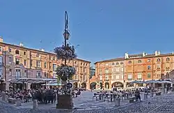 The Place Nationale is a square of the 17th century, entered at each corner by gateways giving access to a large open space surrounded by pink brick houses supported by double rows of arcades.
