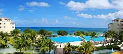 Montego Bay is a popular tourist destination featuring duty-free shopping, a cruise line terminal, several beaches and resorts. The city is served by the Donald Sangster International Airport, the busiest airport in the English Speaking Caribbean, which is located within the official city limits. The city is enclosed in a watershed, drained by several rivers such as the Montego River.[2] Montego Bay may be referred to as "The Second City", "Mobay" or "Bay" locally.