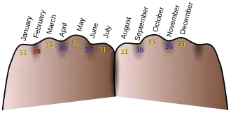 The famous mnemonic Thirty days hath September is a common way of teaching the lengths of the months in the English-speaking world. The knuckles of the four fingers of one's hand and the spaces between them can be used to remember the lengths of the months. By making a fist, each month will be listed as one proceeds across the hand. All months landing on a knuckle are 31 days long and those landing between them are 30 days long, with variable February being the remembered exception. When the knuckle of the index finger is reached (July), go over to the first knuckle on the other fist, held next to the first (or go back to the first knuckle) and continue with August. This physical mnemonic has been taught to primary school students for many decades, if not centuries.[6][7]