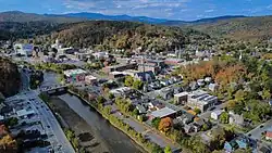 Montpelier is in the north-central area of the state.[14] The Winooski River flows by the south side of the city, passing near the state house and continuing northwest into Chittenden County. The North Branch River, a tributary of the Winooski, also flows through the city. Montpelier's geography leaves it vulnerable to flooding, with three serious floods occurring in 1927, 1992, and 2023.[15] In 1875, fires destroyed 38 buildings in the city, and the commercial area was rebuilt with brick to avoid a repeat of the disaster.[13] The state government contributes to the city's economy, which also relies on insurance and tourism.[12] The insurance industry in Montpelier dates back to the early 19th century.[13] Historically, tradesmen shops and mills along the North Branch also fueled the economy, and sheds for finishing granite from Barre operated along the Winooski.[13] Ski areas are also located near the city.[12][16]
